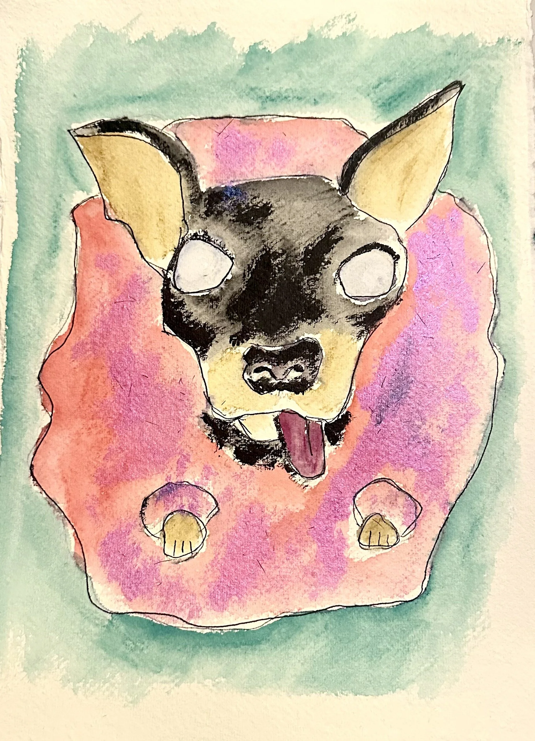 As someone without a phone today, I have done an artistic interpretation of Buttons the Chihuahua for you all. Watercolour, Acrylic & Pen.